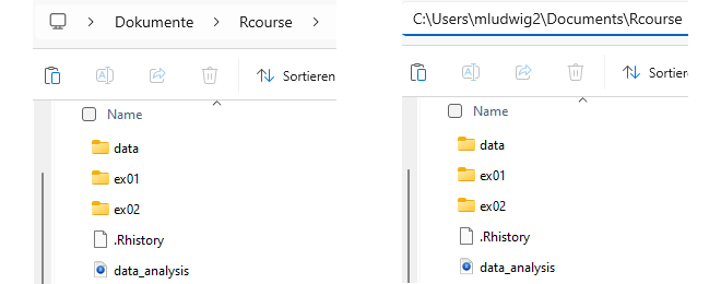 On a Windows operating system, usually, every user has their own “space” in which downloads, documents, images etc. are stored (?@fig-documents). When you now open a directory (e.g. the Rcourse directory Figure 2), you actually navigate through your file system - although Microsoft does a really good to hide the file path from you. If you click in the top bar, you can get the path. Note that in example Figure 2 the system language is German, but the actual path is in English. And further, Windows file paths use the backslash \ instead of the forward slash / to delineate directories. So, if you copy this path and want to use it in the R script, you have to change the backslashes to forward slashes.
